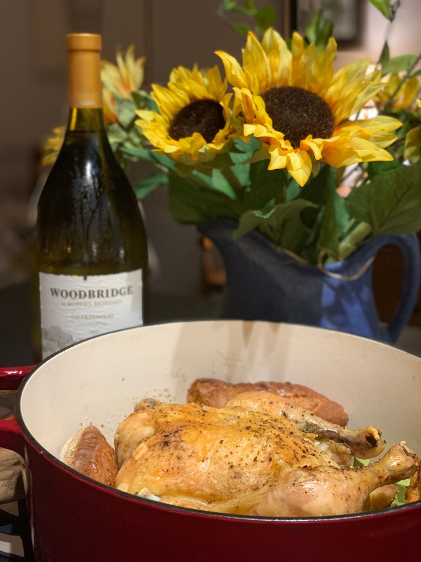 You can actually serve the Les Paresseux’ Poulet’ from the Dutch Oven… Pour yourself a glass of wine. My preference is Chardonnay.. however, a nice Pinot Noir’ would be delicious as well.